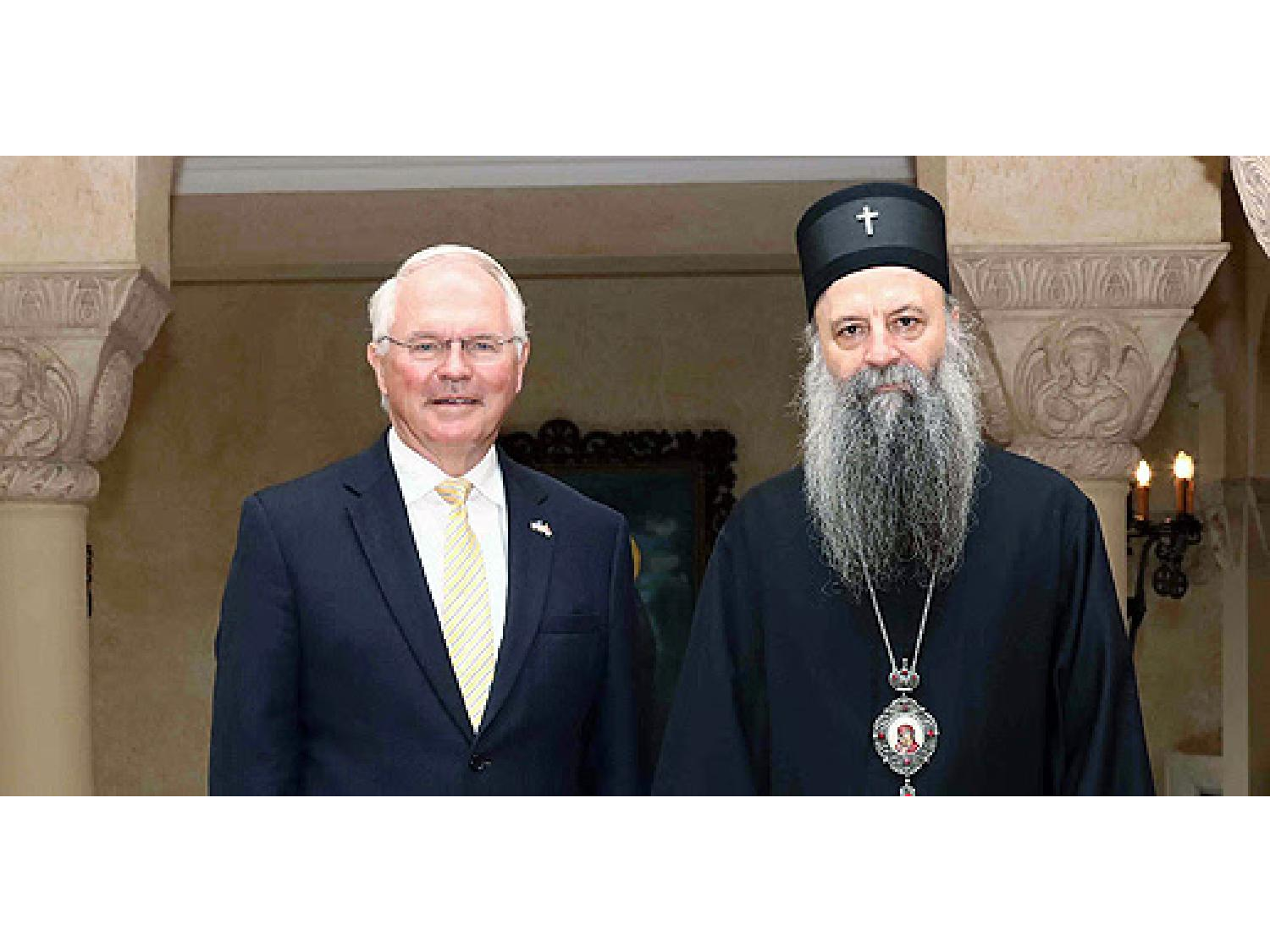 Kako se navodi, patrijarh Porfirije primio je danas Hila u Patrijaršijskom dvoru, a u prijateljskom razgovoru, prvom po stupanju Hila na dužnost u Beogradu, razmotrena je situacija na Kosovu i Metohiji, gde je patrijarh boravio prethodnih dana.