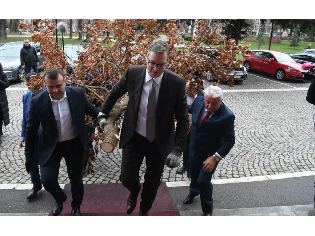 Vučić je u zgradu Generalnog sekretarijata predsednika Republike uneo badnjak, zajedno sa saradnicima među kojima su bili njegov savetnik Milorad Veljović i načelnik beogradske policije Veselin Milić.